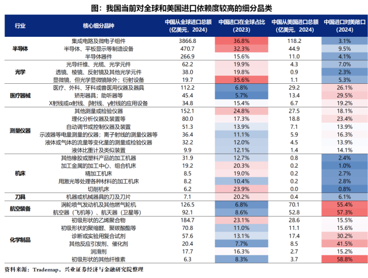 我国当前对全球和美国进口依赖度较高的细分品类,主要集中在电子(半导体组件/设备/器件、光学元件)、医疗器械、机械(测量仪器、机床、刀具)、航空装备、化学制品等。其中,化学制品(纤维素、催化剂、复合试剂)、航空装备、医疗器械等对美进口敞口较大。